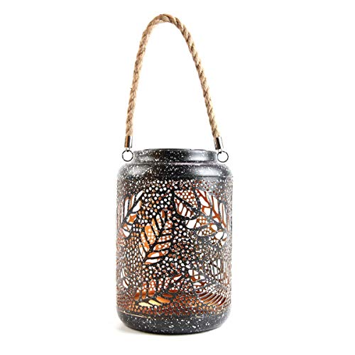 Ombre incredibili - all'interno della lanterna, che ha uno splendido esterno nero macchiato, è un LED bianco caldo che crea un bel bagliore che riflette l'interno dorato. La luce del LED brilla attraverso il delicato design a foglia intagliata, creando belle ombre nella zona circostante.