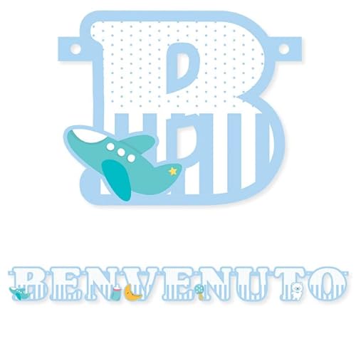 FESTONE in carta scritta BENVENUTO Bianco e Celeste Azzurro a Pois e Strisce - 135x15cm - ghirlanda decorazione - per addobbo tavola per feste, party NASCITA bimbo bambino - GIA' COMPOSTO