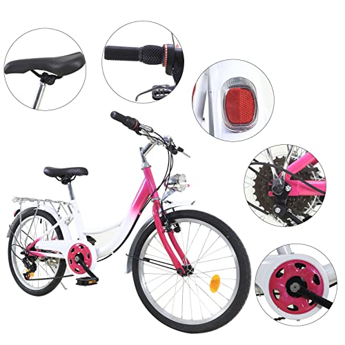 Fetcoi Bicicletta per bambini, 20 pollici, bicicletta per bambini, 6 marce, colore rosa, regolabile in altezza, con luce per ragazzi e ragazze, 110-140 cm.
