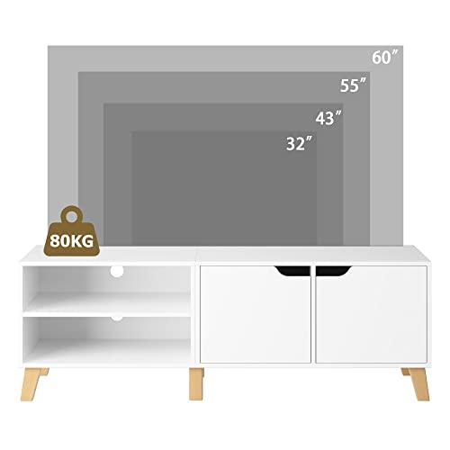 Fevarbord Mobile TV Moderno con 2 Ante e 2 Vano Aperto,Mobiletto Basso in Legno per TV,Mobile Porta TV con con Ripiano Aperto per Soggiorno 140 x 40 x 48 cm (Bianco)