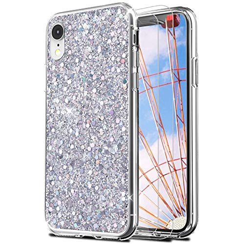 Feyten Cover iPhone XR con Vetro Temperato [2 Pack], Lucciante Brillantini Design TPU Gel Silicone Protettivo Cover Custodia per Apple iPhone XR 6,1" (Argento)