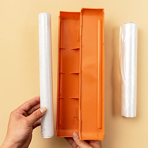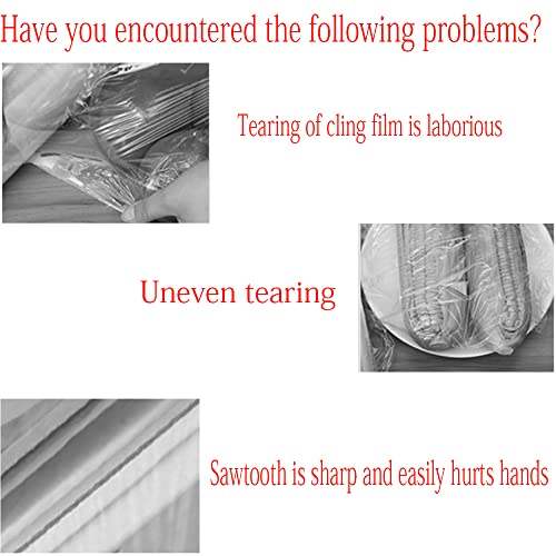 Risparmio di spazio: la dimensione della taglierina per pellicola trasparente è 33*5*5 cm, che non occuperà troppo spazio in casa una volta riposta. È possibile installare il contenitore per la conservazione della freschezza su frigorifero, forno a microonde, forno, ecc. con ventose. Facile da usare.