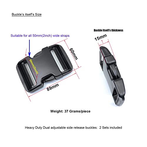 【Fibbie in plastica】 Le nostre fibbie a sgancio rapido regolabile doppie da 2 pollici/51 mm hanno una buona flessibilità e una forte trazione, molto più spesse e molto resistenti rispetto alle normali fibbie in plastica. La clip con fibbia in plastica può resistere a una forza di trazione di 132 libbre (60 kg).