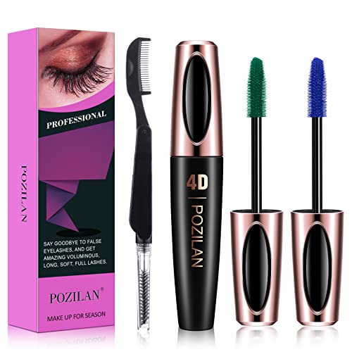 2 Pack 4D Silk Fiber Lash Mascara Blue & Green Waterproof with Folding Eyelash Comb Brush - Lengthening, Volumizing, Long-Lasting, Natural Eye Makeup