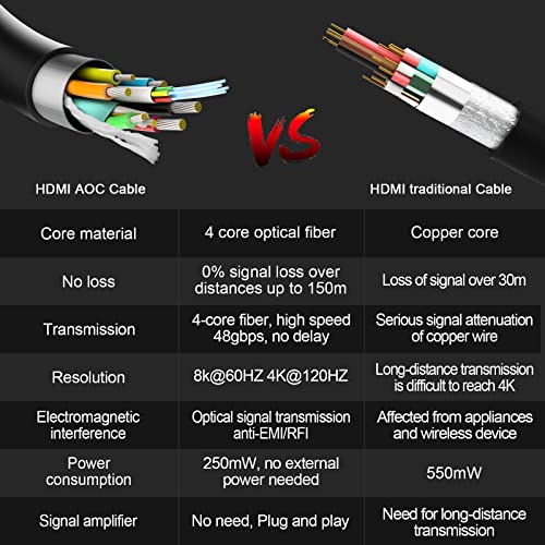 ✔【Caratteristiche principali】Il cavo HDMI in fibra ottica 8K supporta la lunga distanza a 8K @60Hz, 4K @60Hz/120Hz/144Hz e risoluzione fino a 10K. Nessuna perdita di segnale. Compatibile con Dolby Atmos, Dolby Vision, HDCP 2.2 & 2.3, DTS:X, Dynamic HDR, BT.2020, eARC, ALLM, QFT, QMS, VRR. Retrocompatibile con le versioni precedenti di HDMI.★ Se avete bisogno di una maggiore frequenza di aggiornamento (come, 4K@120Hz/144Hz) assicurarsi che il dispositivo lo supportino.