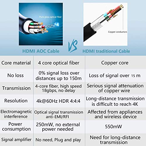 Cavo in fibra ottica HDMI ad alta velocità: trasferisce il segnale HDMI per una maggiore distanza rispetto al cavo in fibra ottica, il cavo in fibra ottica HDMI è realizzato in fibra di vetro di alta qualità per una trasmissione pura del segnale. Il cavo HDMI su fibra è progettato per inviare istantaneamente dati video e audio (informazioni) attraverso fibra ottica e senza latenza percettibile a distanze più lunghe.