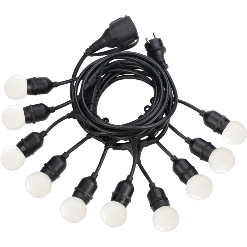 Cavo con portalampade e occhielli di ancoraggio in materiale plastico nero. Fornito con spina per esterni. L 605 x H 14 x P 4 cm E27 max 10 x 15W IP:44