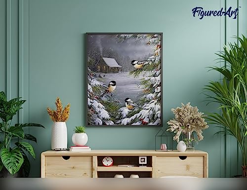 Figured'Art Dipingere con i Numeri - Paint by Numbers Tre Uccelli Nella Neve, Passatempo per Adulti, Kit Completo, Hobby Creativi - 40x50cm cornice in legno fai da te