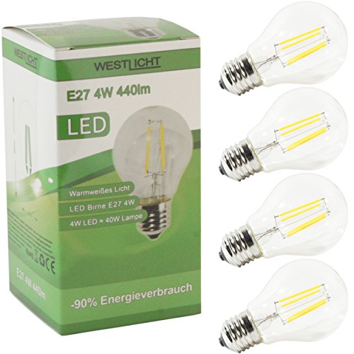 West luce E27 Filament | Lampadina a LED | AC 230 V 4 W 440 lumens 270° bianco caldo, Set da 4, E27, 4.0 wattsW, 230 voltsV
