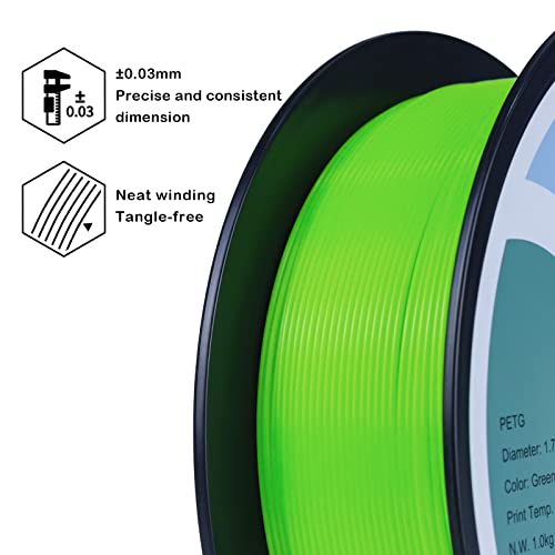 【Precisione Dimensionale e Coerenza】 Filamento PETG 1.75mm 1kg, tolleranza diametro +/-0.03mm, peso netto 1kg (2.2lb) filamento. Il filamento PETG ha una migliore scorrevolezza. Rotondità costante, meno trafilatura, meno deformazioni, forte adesione tra gli strati. Nessun corpo estraneo, nessuna impurità.