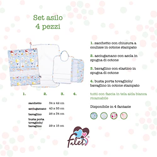Filet - Set Asilo Quattro Pezzi Ricamabile, Composto da Bavaglino con Elastico, Asciugamano, Sacchetto per il Cambio e Busta Portatovagliolo/Bavaglino, Made in Italy, Fantasia Sport Fondo Azzurro