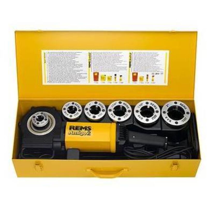 Filiera elettrica portatile con bussole a cambio rapido. Per filettature di tubi 1/8-2, 16-50 mm, bulloni 6-30 mm, 1/4 - 1 . Set R 1/2-3/4-1-11/4-11/2-2. Per filettatura destra e sinistra . Elettroutensile con riduttore esente da manutenzione, potente motore universale 230 V, 50-60 Hz, 1700 W, interrutore di sicurezza, posizionamento automatico dei carboncini con aumento della prestazione con l'inversione del senso di rotazione. In robusta cassetta metallica.(DianFlex)Misura: 1/2 -2