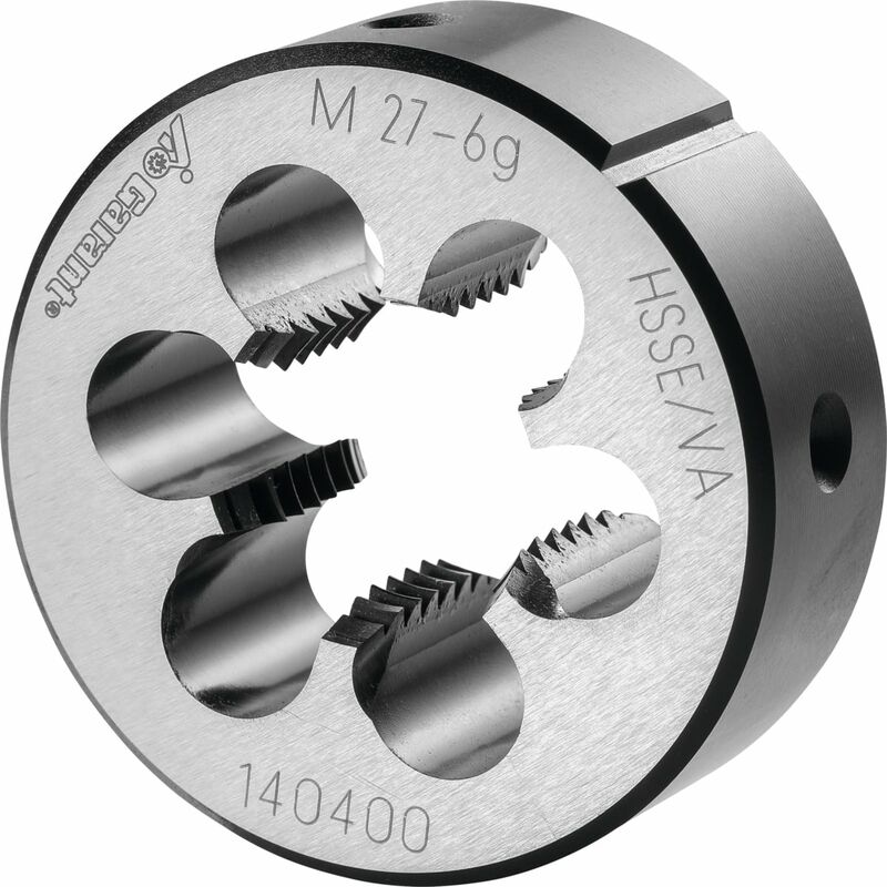 DescrizioneEsecuzione:Forma chiusa preincisa. ≥ M3 con imbocco corretto su entrambi i lati per agevolare l'esecuzione del filetto ed evacuare correttamente i trucioli nella direzione di taglio. Imbocco a 2 spire. Lappate e nitrurate, angolo di spoglia superiore ca. 15°.Dati tecnici Misura del filetto M27 Tipo di filettatura M Angolo di filetto 60 ° Materiale da taglio HSS E Norma EN 22568 Classe di tolleranza DIN 13 6g Direzione di taglio destra Passo 3 mm ⌀ esterno 65 mm Altezza 25 mm Tipo di prodotto Filiere Codice articolo 140400 M27 EAN / GTIN 4045197714800