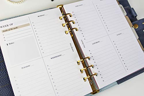 una ricarica di fogli con vista settimanale e senza date, che vi permetterà di iniziare ad usarlo nel momento in cui vi arriverà. Il formato senza data significa che non ci sono più pagine da sprecare, tutto ciò che non si utilizzerà per il mese prossimo o l'anno prossimo