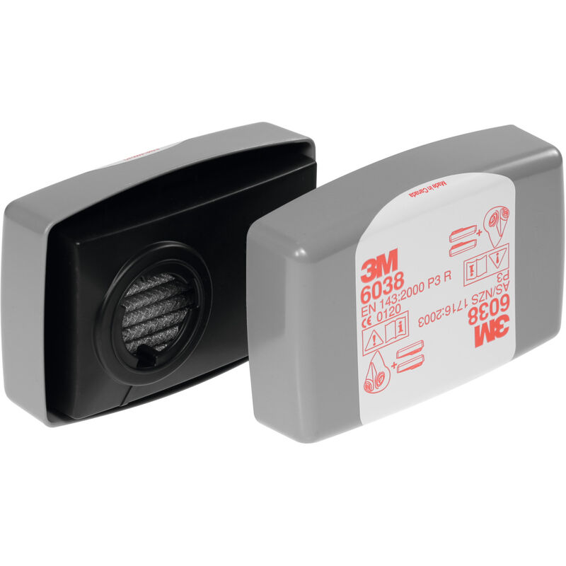 097240 Dati tecnici Tipo di prodotto Filtro antiparticelle per respiratore Attributo del nome del prodotto 10 paia Denominazione originale prodotto 6038 Contenuto 10 Per codice a colori Sistema a baionetta 3M™ Grado di protezione P3R+carbone attivo