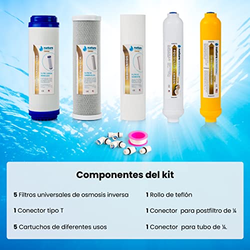 Kit di 5 filtri universali per osmosi inversa - Include rotolo di teflon, connettori e T, ideale per apparecchiature a 6 fasi universali - Nature Water Professionals