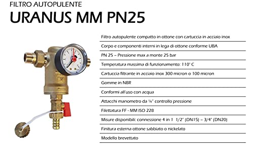 Filtro dell'acqua autopulente Malgorani, maglia 100 micron, attacchi MM 1/2". Corpo in ottone e filtro in acciaio inox per acqua potabile.