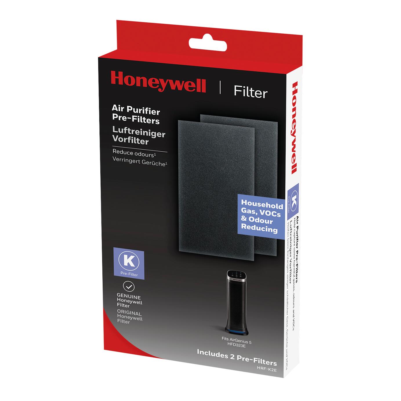 Prefiltro Honeywell HRF-K2E K compatibile con purificatore d'aria Honeywell HFD323E air genius 5 Una confezione contiene 2 pre-filtri. Una confezione contiene 2 pre-filtri Durata stimata del filtro: 3 mesi Aiuta ad assorbire i comuni gas e Composti organici volatili (COV) e il fumo presenti in casa. I pre-filtri di ricambio Honeywell HRF-K2 ("K") per il depuratore d'aria sono un complemento molto utile per il filtro ifD® usato nel purificatore d'aria. Questi pre-filtri opzionali catturano le particelle più grandi prima che raggiungano il filtro iFD® nel purificatore d'aria. In questo processo, puliscono l'aria e catturano alcuni gas nocivi e composti organici volatili (COV). L'aria viene attirata in modo continuo, pulendo l'aria 5 volte l'ora Il pre-filtro cattura le particelle più grandi. Il filtro IfD cattura fino al 99,9% delle particelle di dimensioni fino a 0,3 micron .Lo ionizzatore aiuta a migliorare le prestazioni del depuratore d'aria