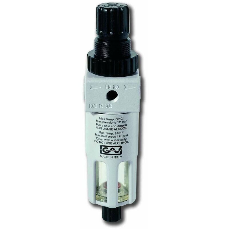Descrizione prodotto FR180 Filtro - Riduttore Pressione max. in entrata: 12 BAR Filtraggio: 10 µm Campo di regolazione: 0 - 10 BAR Portata: 1800 Nl / min 6 BAR Capacità tazza: 30 ml Particolarità: Manopola di regolazione con blocco Misura: FR180 1/4