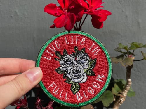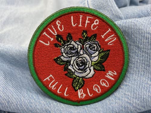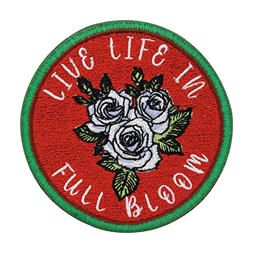 Finally Home Live Life in Full Bloom - Toppa termoadesiva con rose bianche, con fiori di rosa, toppe floreali, colore rosso e verde
