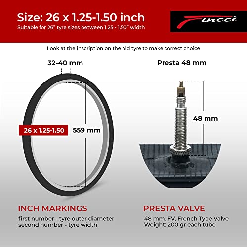 Fincci 26 x 1,25 1,50 Pollici 48mm Presta Valvola Interna Camera d'Aria per Strada MTB Montagna Ibrida Bici Bicicletta