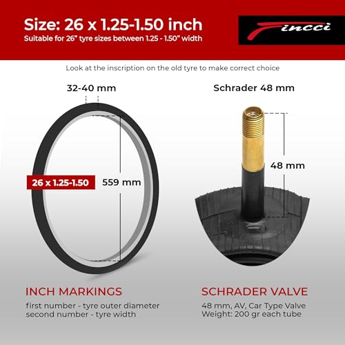 Fincci 26 x 1,25 1,50 Pollici 48mm Schrader Valvola Interna Camera d'Aria per Strada MTB Montagna Ibrida Bici Bicicletta