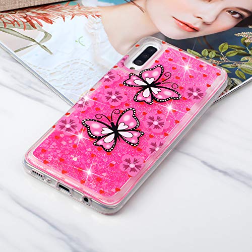 Finemoco Cover per Samsung Galaxy A50 Custodia Silicone Trasparente Morbida Sottile Protezione Cover Glitter 3D Rosa Liquido Antiurto Gomma TPU Bumper Case + Vetro Temperato Pellicola,Farfalla