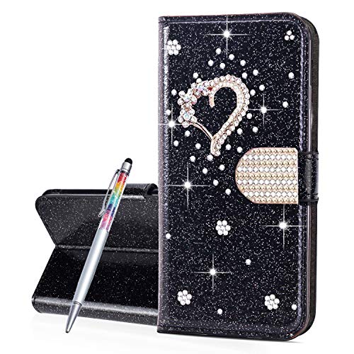 Finemoco Cover per Samsung Galaxy Note 20 Ultra Custodia PU in Pelle Portafoglio a Libro Flip Cover Cuore Nero Brillantini Glitter Cellulare Cover Antiurto Magnetica Folio Case Morbida Silicone Bumper