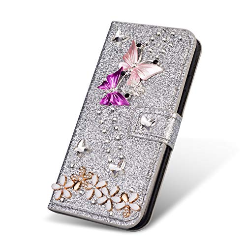 Finemoco Custodia in Pelle per Samsung Galaxy S21 Ultra 5G Cover Portafoglio a Libro Galaxy S21 Ultra Flip Cover Bling Glitter Magnetica Folio Case Morbida Silicone TPU Bumper Protezione Cover,Argento