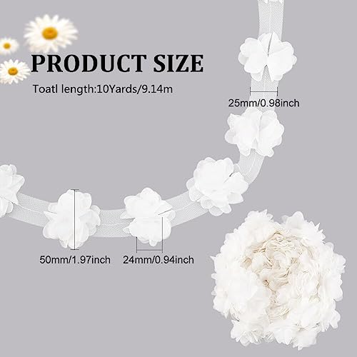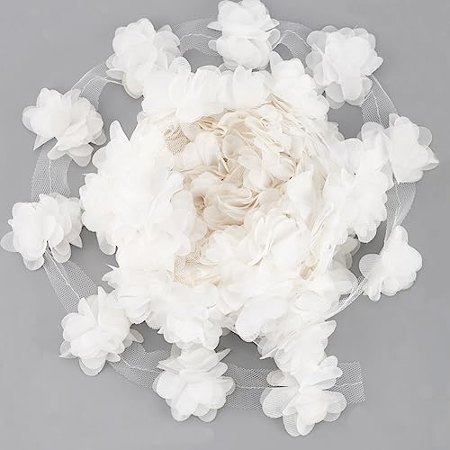 FINGERINSPIRE Bordo in chiffon con fiori in pizzo, 9,1 m di larghezza, 25 mm di larghezza, per cucire 3D, in chiffon, con grappolo di fiori bianco, realizzato a mano, decorazione per abiti da sposa