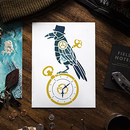 FINGERINSPIRE Stencil a forma di corvo Steampunk, 21 x 29,7 cm, per pittura, disegno a corvo, modello orologio primaverile, stencil in stile meccanico per mobili, porte, decorazione da parete