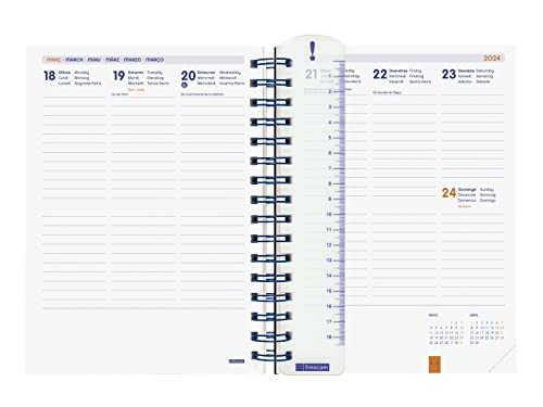 Interno: Settimana Vista Verticale. Visione settimanale completa in verticale. Agenda in catalano con rendita multilingue: catalano, inglese, francese, tedesco, italiano e portoghese. Con indicazione nella rendita delle festività della Catalogna.