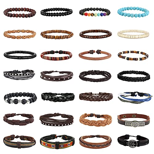 Finrezio 28 Pezzi Bracciale in Pelle Intrecciata per Uomo Donna Bracciale in Legno Bracciale Albero della Vita Bracciale Avvolgente con Polsino Regolabile