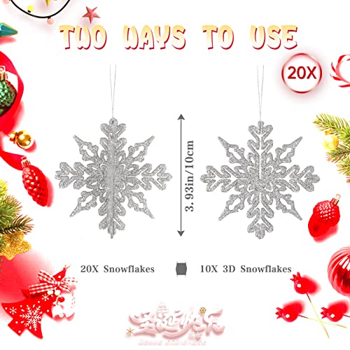Fiocchi di Neve di Natale, 20 Pezzi 10cm/3,93 inch Glitter Argento Fiocchi di Neve in Plastica, Fiocchi di Neve di Natale per Festa di Natale
