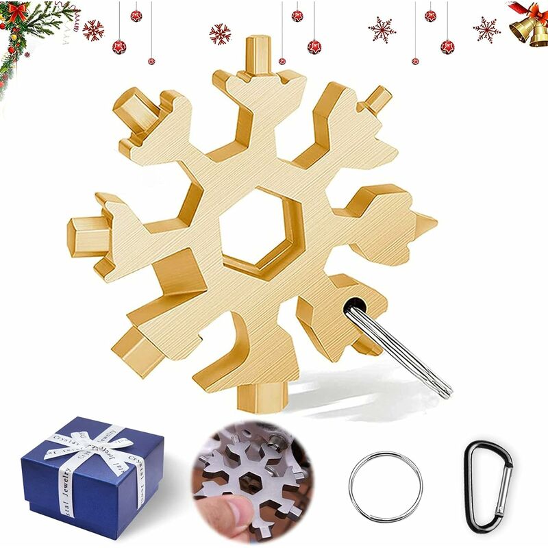 【Strumenti per fiocchi di neve di Natale】 Include uno strumento multifunzione per fiocchi di neve in acciaio inossidabile, una squisita confezione regalo, un portachiavi e un moschettone. Gli strumenti Snowflake sono disponibili in nero, argento, oro e nel colore che preferisci. Piccolo ma non pesante, design unico del fiocco di neve, facile da trasportare.❄ 【MATERIALI DI ALTA QUALITÀ】 Realizzato in acciaio inossidabile, lo Snowflake Multitool misura 6,4 cm di diametro e pesa 2,3 once. Realizzato in acciaio inossidabile di alta qualità, resistente alla corrosione, non facile da arrugginire, lucidato, rotondo e durevole, facile da trasportare.❄ 【Multiutensile portatile 18 in 1】 Ti fornisce 18 fantastici tipi di strumenti, una nuova chiave inglese ha migliorato la neve scarpa per soddisfare le vostre diverse esigenze. Può essere utilizzato come portachiavi, apribottiglie, piccolo cacciavite Phillips, cacciavite a lama piatta, chiave inglese, chiave a brugola, ecc. Piccolo e comodo da