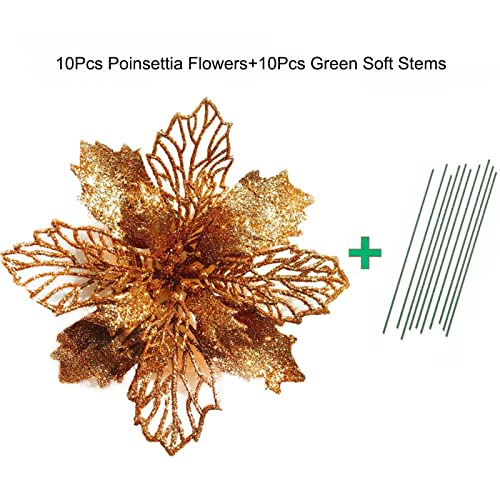 Fiore per Natale, 10 pezzi con glitter a forma di stella di Natale, ghirlanda di Natale, albero di Natale, fiori con 10 punti verdi morbidi (bronzo)