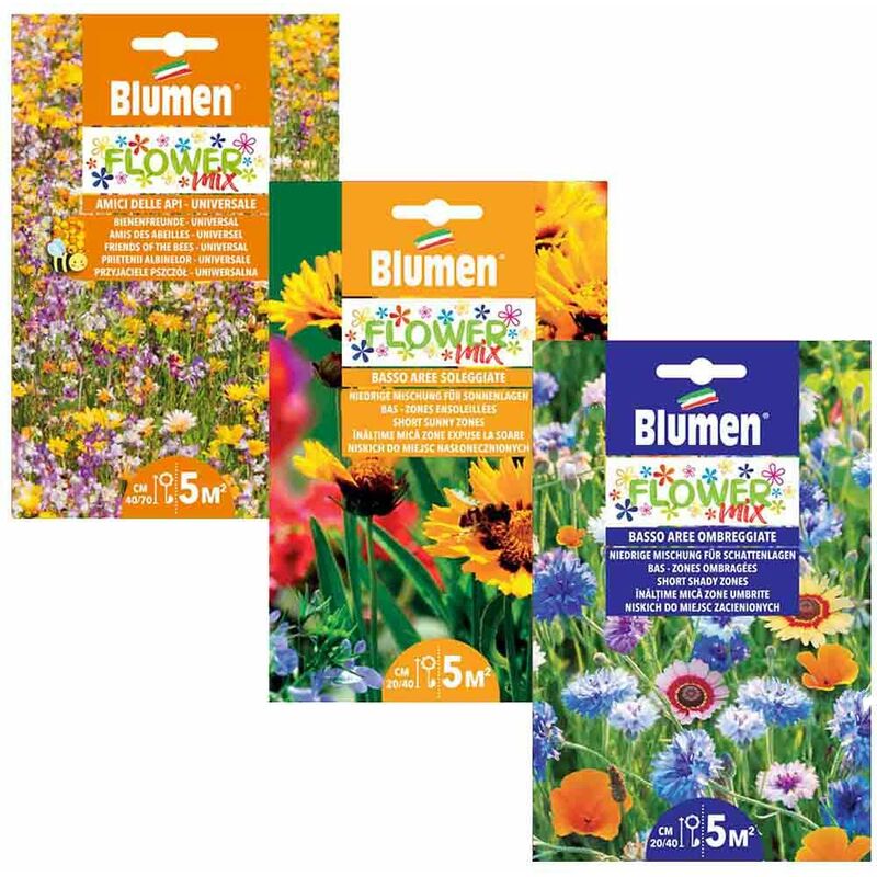 Un set di 3 bustine di fiori a marchio Blumen per far diventare il tuo giardino un posto colorato e profumato. SET FIORI 2: set di 3 bustine di fiori di cui 1 bustina con fiori universali, 1 bustina di fiori bassi ideali per zone con soleggiate, 1 bustina di fiori bassi per zone ombreggiate. Ogni bustina di semi copre circa 5 metri quadrati. Il mix di fiori Blumen è ideale per dare un tocco di colore e di natura al tuo giardino. Riscopri il pollice verde che è in te! Composizione: Amici delle Api - Universale: Lobularia maritima L., Anethum graveolens, Mirabilis jalapa, Centaurea cyanus, Borago offi cinalis, Chrysanthemum segetum, Papaver rhoeas L., Agrostemma coeli-rosa, Coreopsis tinctoria, Cosmos bipinnatus, Cosmos sulphureus, Echium plantagineum L., Gaillardia picta, Cheiranthus maritimus, Lupinus hartwegii, Matthiola Bicornis, Malva sylvestris, Agrostemma githago, Tagetes patula, Oenothera lamarckiana, Phacelia tanacetifolia, Reseda odorata. (In percentuali variabili). Basso Aree