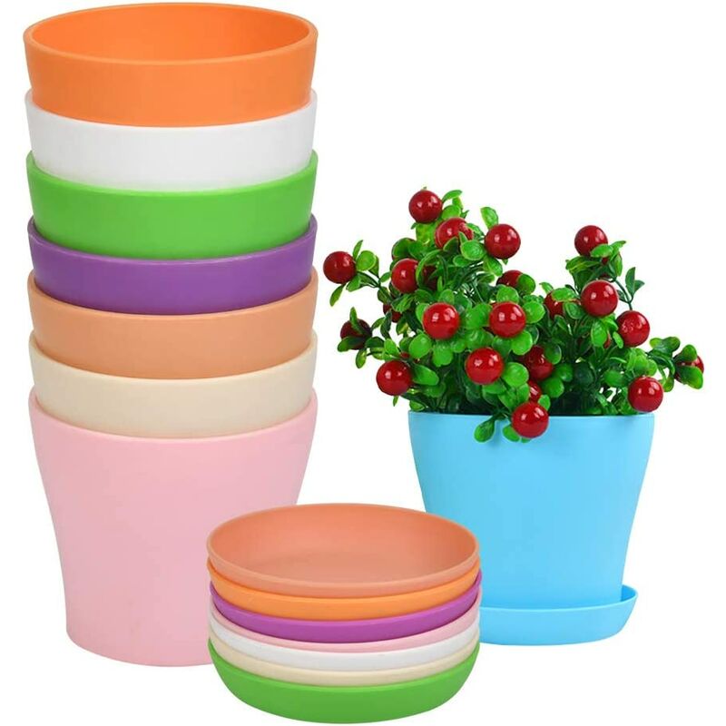 Con piastre - 8 vasi di fiori di plastica, ciascuno con un piatto dello stesso colore, non perdono, adatto per impianti interni ed esterni. [Pentola di fiori di alta qualità] Il vaso di fiori è realizzato in plastica PP di alta qualità, spessa e solida, non facile da distorcere, e può rimanere al sole per diverse stagioni senza diventare fragili. [Dimensione] 11 cm, rotondo rotondo, diametro 8 cm in fondo, altezza: 9 cm. Molto adatto a tutti i tipi di piccole piante, come piante succulente, margherite, menta, pomodori, ecc. [Drenaggio e ventilazione] Ci sono piccoli fori di drenaggio nella parte inferiore del flowerpot per mantenere il terreno asciutto e ventilato. [vasi da fiori colorati] Ci sono 8 colori vivaci, bianco, beige, rosa, albicocca, arancia, blu, verde e viola. Leggero e resistente, può abbellire la tua stanza, giardino o ufficio. 8 pezzi di vasi da fiori di plastica colorati 11 cm, adatti per piante e fiori in ufficio o a casa Descrizione 8 colori brillanti sono