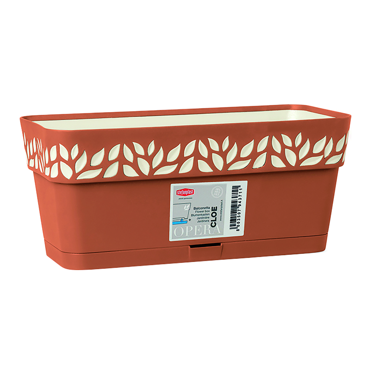 Balconetta linea Opera in plastica color terra d'ombra, decoro Cloe e dimensioni 30 x 13 x h 12 cm. Ideale per creare raffinate soluzioni scenografiche con fiori e piante. Balconetta caratterizzata da un contrasto cromatico che disegna dettagli delicati e romantici. Prodotta in Italia, il materiale con cui è realizzata è al 100% riciclabile. Dotata di riserva d'acqua per una corretta irrigazione di fiori e piante