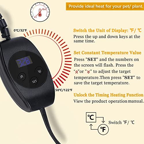 TEMPERATURA COSTANTE INTELLIGENTE - Facile da usare il termostato, con solo 3 pulsanti è possibile impostare facilmente la temperatura o alternare il display tra Fahrenheit/Celsius in pochi secondi. La temperatura massima di riscaldamento può raggiungere i 50°C (122°F). FIPASEN sotto il cuscinetto termico del serbatoio fornisce al tuo animale domestico o alla tua pianta un calore delicato e costante per 24 ore e monitora e controlla la temperatura in ogni momento.