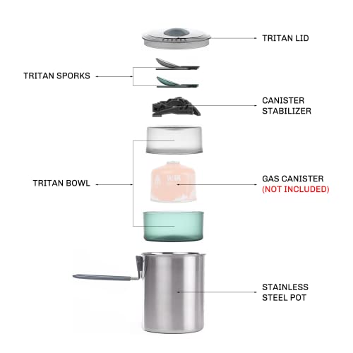 ✅SET DA CUCINA 7 PEZZI - Include una pentola da 1,2L, un coperchio, 2 ciotole in tritan (450ml), 2 forchette in tritan e un supporto per bombola a gas. Ha anche spazio per altri mini fornelli e accessori da campeggio. Un eccellente kit da cucina per 1-2 escursionisti.