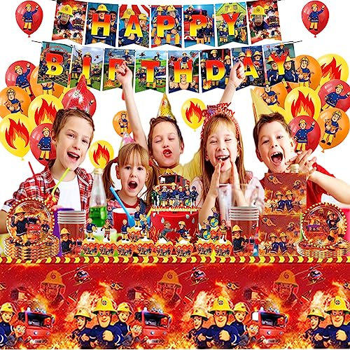 Fireman Sam Stoviglie Compleanno,Addobbi Compleanno Fireman Sam,Kit Feste Compleanno Sam il Pompiere,Palloncini,Banner,Piatto,Tovaglia,Decorazioni Compleanno Bambini