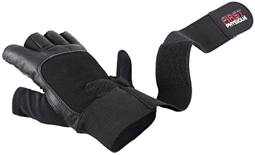 FIRST PHYSIQUE - Guanti in morbidissima pelle, senza dita, per sollevamento pesi, con supporto resistente per il polso (cinturino da 33 cm), palmo imbottito, per prevenire vesciche e calli, modello unisex