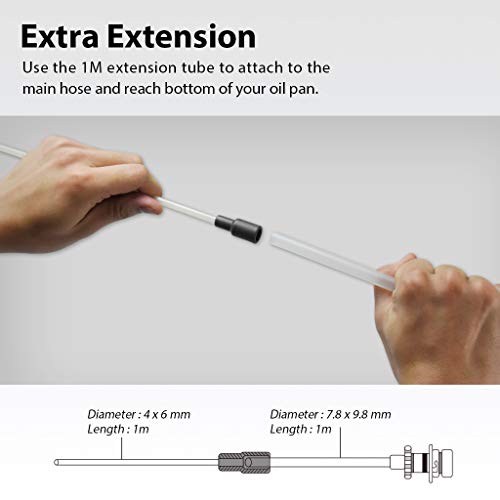 Extenstoin extra: usa il tubo di prolunga da 39,3 pollici (1 M) per raggiungere il fondo della coppa dell'olio. Collegare con il nostro A1106B (tubo flessibile da 7,8 * 9,8 mm) insieme all'adattatore in gomma per essere lungo 2 metri per raggiungere il fondo della coppa dell'olio.