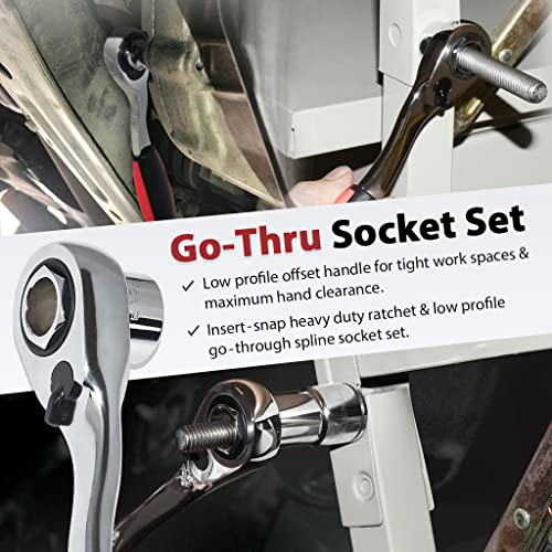 Set di bussole Go-Through -- Impugnatura offset a basso profilo con cricchetto a innesto per impieghi pesanti e bussole go-thru, ideale per spazi di lavoro ristretti e massimo spazio per le mani.