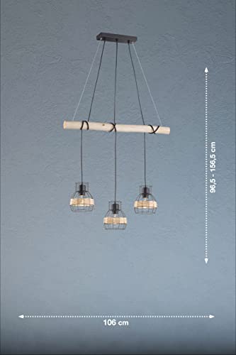 Fischer 60798, Lampadario a sospensione Straw, a 3 luci, con travi in legno e reticoli, con nastro in rattan, metallo nero sabbia, legno e rattan naturale, 70 x 14,5 cm
