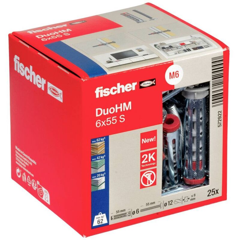 Dettagli tecnici Caratteristiche tasselli incl. Vite Contenuto 25 pz. Diam. est. 12 mm Dimensione del prodotto, lunghezza 55 mm Materiale Poliammide Tipo prodotto Tasselli per vuoti e cavità Diametro punta 12 mm Profondità min. del foro: 55 mm Lunghezza del tassello 55 mm Dimensione vite 6 x 55 mm Spessore piastra 9,5 - 30 mm Azionamento PZ3 Max. Spessore della parte di montaggio 10 mm Min. Profondità cavità 45 mm Tassello per cavità fischer DuoHM 6 x 55 S PH PZ, vite a testa bombata, azionamento PZ Il tassello per cavità DuoHM copre con una sola lunghezza tutti i più comuni spessori di materiale da costruzione di 9,5 - 30 mm. Grazie alla nuova ed esclusiva combinazione di poliammide e metallo, il DuoHM consente carichi elevati e la massima flessibilità nei materiali da costruzione. Il manicotto in metallo si piega dietro il materiale da costruzione e si pressa sul retro del pannello, il tassello in plastica si strappa nel pannello. Il montaggio del DuoHM avviene in modo rapido e
