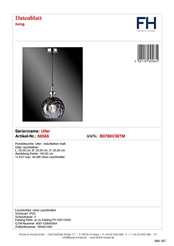 Fischer & Honsel Lampada a sospensione Uller 69566, 1 x E27, max. 40,0 Watt, colore nichel, 20 x 20 x 140 cm (lunghezza x larghezza x altezza)