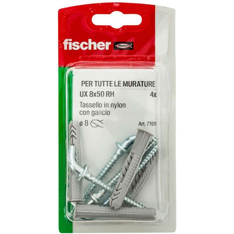 Dalla linea di articoli dedicati ai fissaggi e ancoraggi a marchio FISCHER, il kit di tasselli UX 8 X 50 H K e ganci dritti in acciaio, è composto dai tasselli in nylon, dal Ø di 8 mm, sono caratterizzati dal principio di funzionamento universale, che avviene per annodamento ed espansione, e ne permette il suo utilizzo in tutti i materiali di supporto pieni, forati e in lastre. Il fissaggio UX è la scelta giusta se non si conosce il materiale di base, infatti grazie alle alette laterali dell'UX assicurano una guidaottimale della vite. Le alette seghettate anti-rotazione impediscono la rotazione nel foro del tassello, questo garantisce la massima sicurezza durante l'installazione. I tasselli UX fischer sono la scelta migliore per fissare qualsiasi cosa, su superfici come calcestruzzo, mattone pieno, blocchi cavi, pietra naturale.