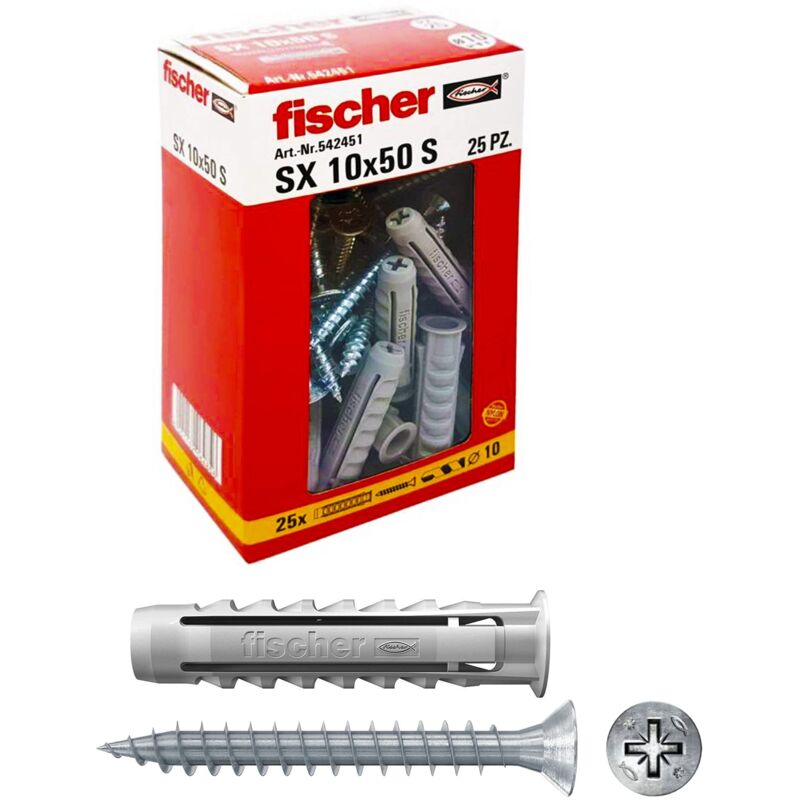 Fischer 25 Tasselli SX con vite, 10 x 50 mm, per Muro pieno e Mattone Forato, 542451 10 x 50 mm con viteSize: 10 x 50 mm con vite;